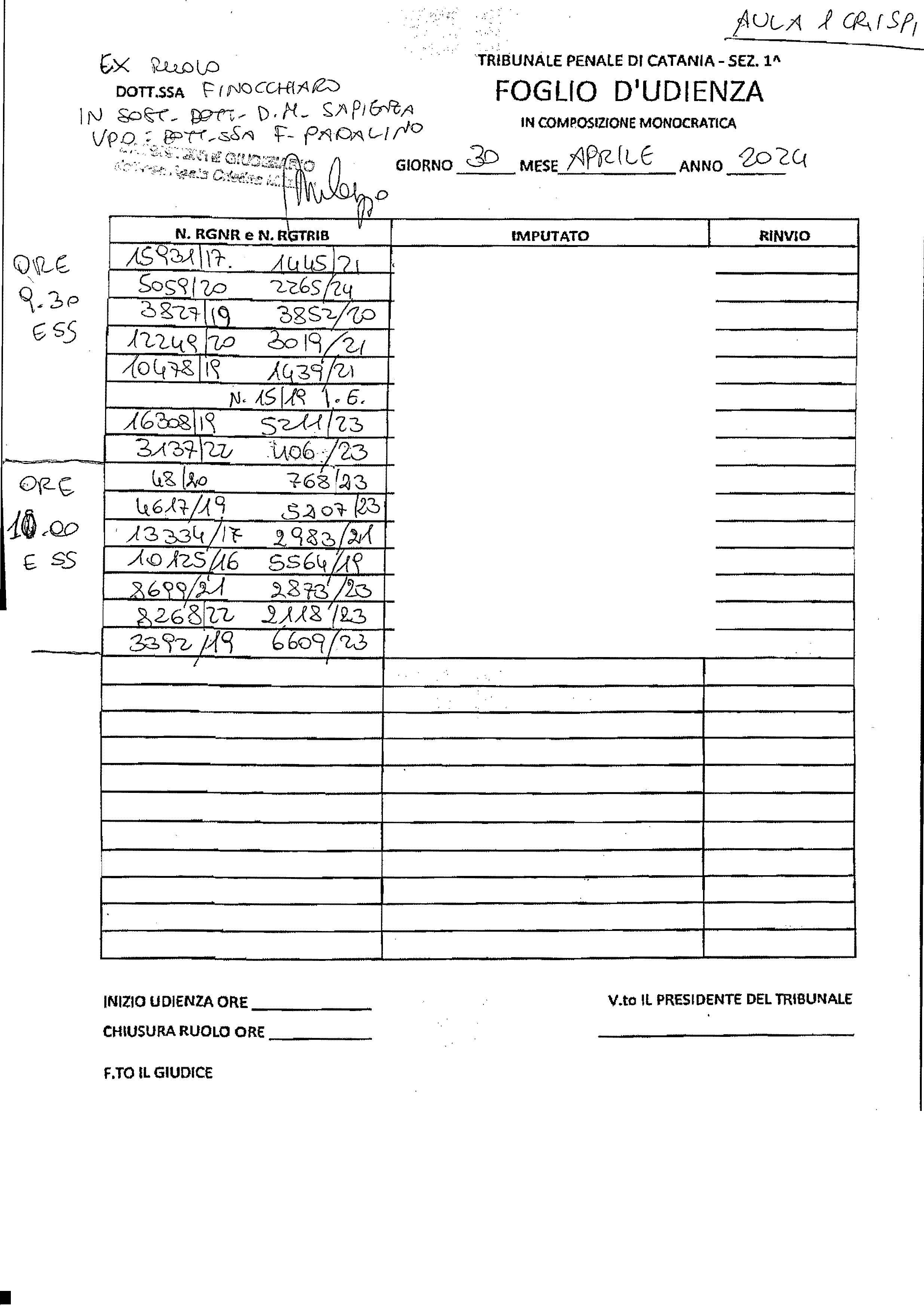 04/06/2025 - RUOLO UDIENZA 04.06.2025 DOTT. PRINCIPATO AULA 1 CRISPI Scarica il file In formato PDF - 90 Kb |