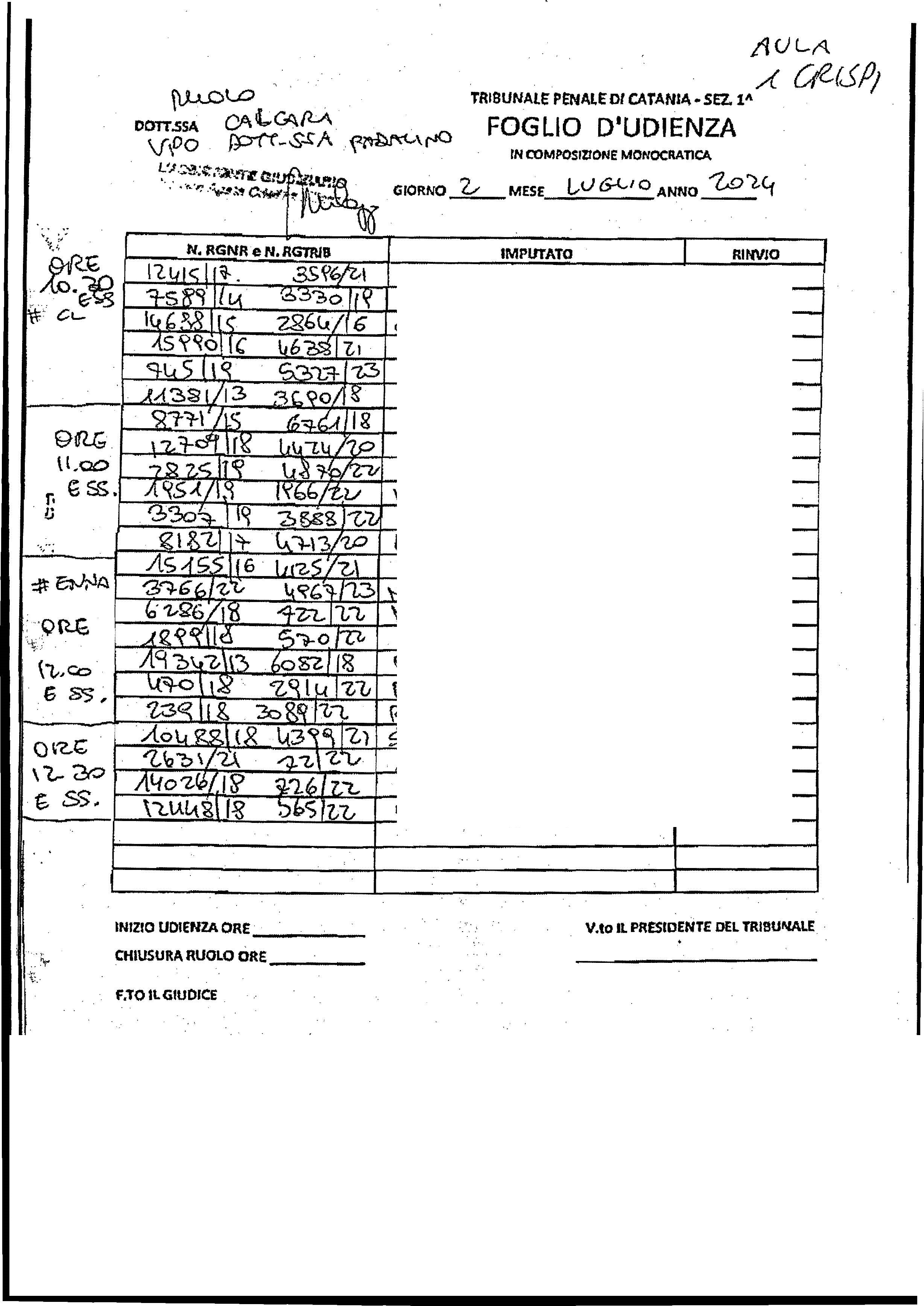 14/07/2025 - UDIENZA STRAORDINARIA - MONOCRATICA - DOTT.SSA CATALANO - ORE 12.00 e ss - Aula I VERGA Scarica il file In formato PDF - 97 Kb |